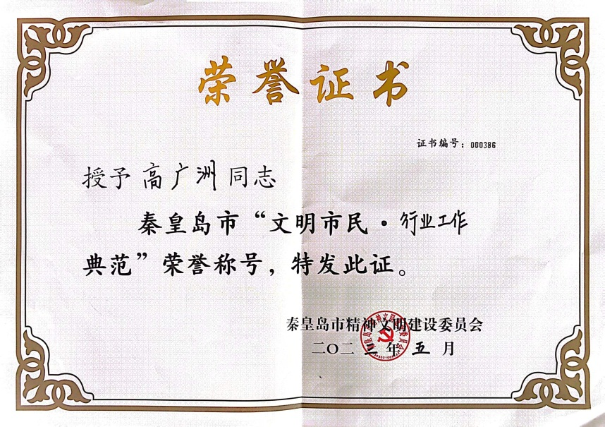 華電測控高廣洲同志榮獲秦皇島市“文明市民 行業工作典范”榮譽稱號